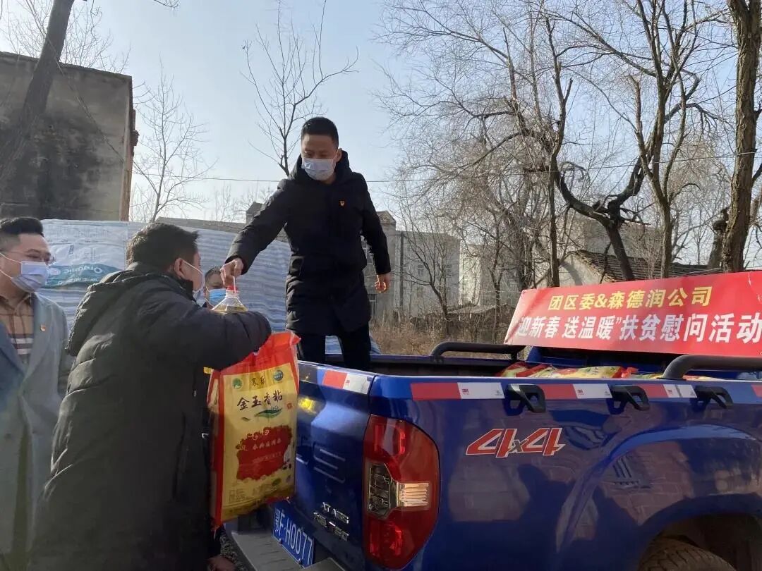 团区委书记刘杨、森德润公司总经理兼党支部书记张森同志走村入户,肩挑手提,冒着冬日的严寒,为每一名贫困户送去一袋大米和一桶油。带给他们党和国家的温暖,让每一户家庭都如沐春风。